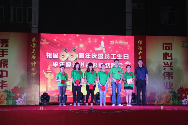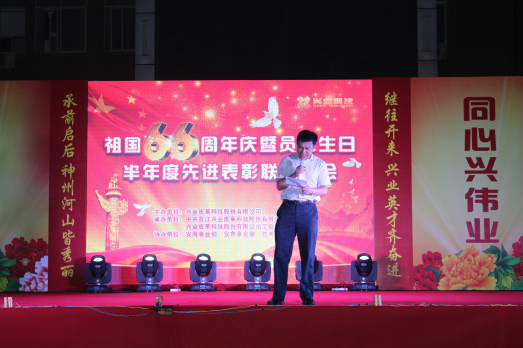 9月28日晚上18时,兴业科技一年一度的“迎国庆、奖先进、庆生日”晚会隆重举行。既为了迎国庆、颂祖国,也为了给9、10月过生日的兴业同仁们庆祝生日,更为了表彰2015年上半年优秀个人及优秀集体的“牛项奖”。虽然天下着雨,但兴业同仁们的热情不减,整个会场都充满着欢乐的气氛。与往年相比,今年的晚会节目更给力、氛围更热烈。