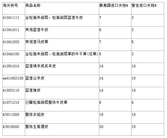 三、继续对部分半成品革、水貂、狐狸等10个海关税号的进口关税暂时下调